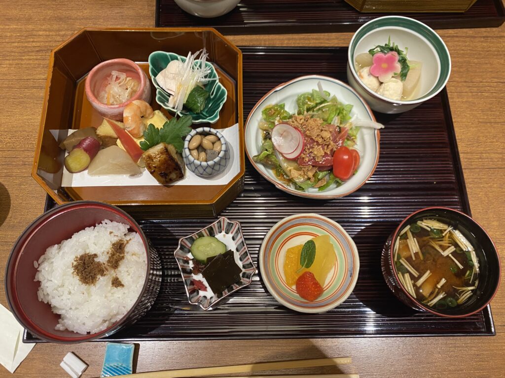 今回いただいたのは、見た目にも鮮やかなランチ。 運ばれてきたお盆の上には、四季折々の食材が美しく並んでいました。